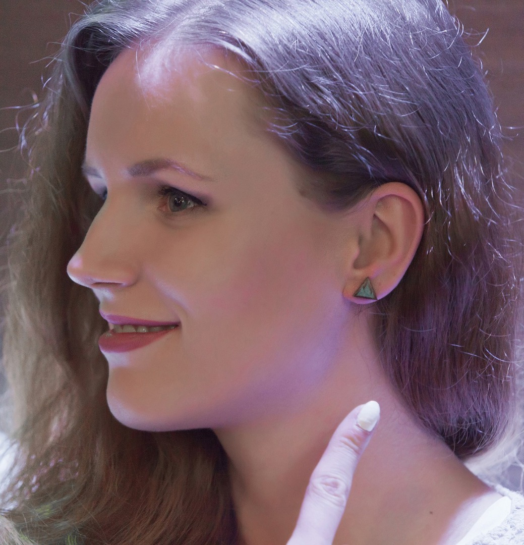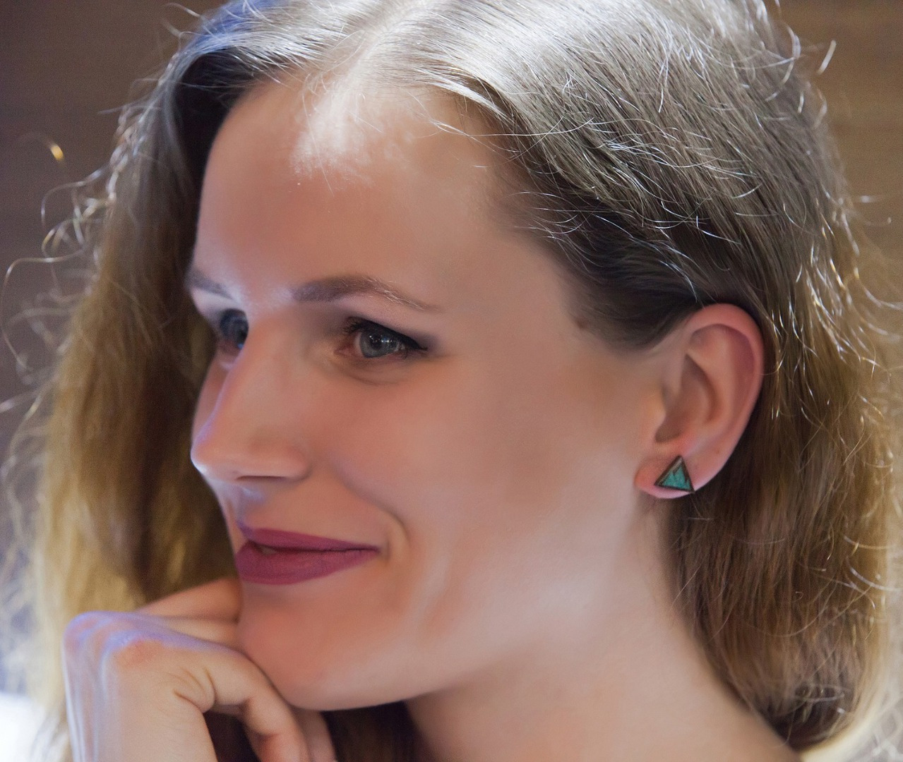 Trojuholník ukazuje smer a symbolizuje silu. Avšak tento šperk ukrýva ešte inú myšlienku. Je tam vášeň pre krásu a našich hôr. Tieto ľahučké a elegantné náušničky určite ocenia mnohé žienky (horalky). Sú vyrobené z čierneho orecha, drveného tyrkysového kameňa a striebra Ag 925/1000